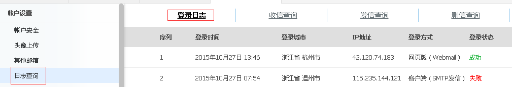 登錄郵箱后點(diǎn)擊右上角“郵箱設(shè)置”,在左側(cè)展開設(shè)置功能列表中點(diǎn)擊“日志查詢”即可查看,最多可顯示200條近30天內(nèi)的登錄日志。