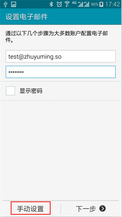 2.填寫(xiě)郵箱的 email 地址及郵箱密碼,建議單擊 手動(dòng)配置 :