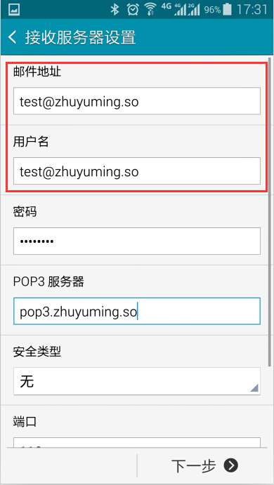 下面以填 POP3 協(xié)議設(shè)置為例,填寫(xiě)接收服務(wù)器地址及用戶(hù)名。
