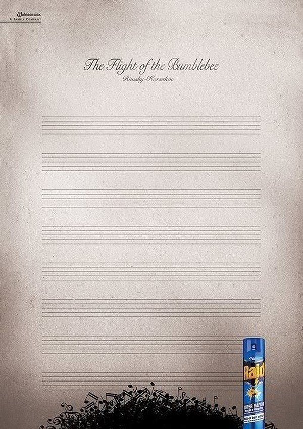 這個Raid殺蟲劑的廣告,用 產(chǎn)品“殺死”了著名音樂家——Rimsky-Korsakov譜寫的“大黃蜂飛行”的音符(把音符比作擾人的蚊蟲),意味著Raid殺蟲劑足夠強大,可以消除任何蟲子。 這個廣告看似很荒謬,但是這種如此明顯的不真實會讓人覺得搞笑,而不是欺騙或誤導(dǎo)。