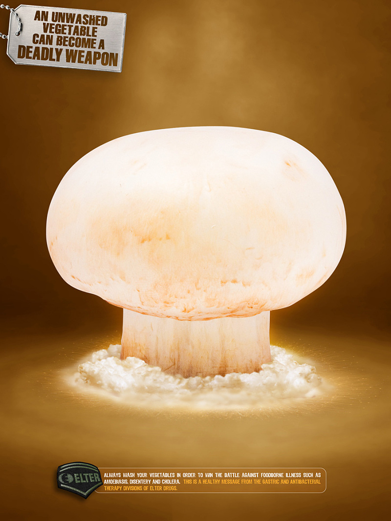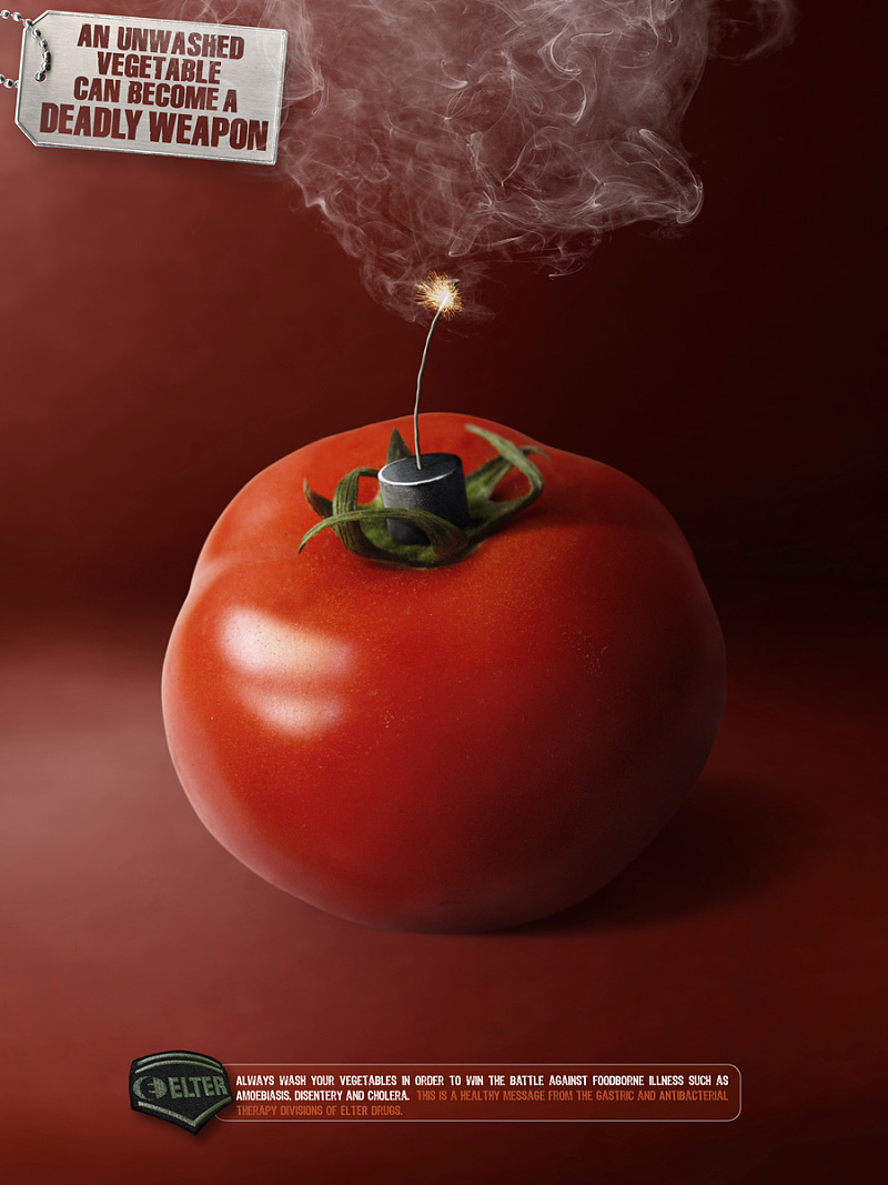 這個廣告通過把一個未洗的洋薊比喻成炸彈來警告公眾食源性疾病的危害。 通過創(chuàng)建一個視覺比喻,Elter藥業(yè)公司能夠傳達有關(guān)食品安全和Elter藥物自己的抗菌治療部門的強烈信息,而不顯示任何敏感的圖像。