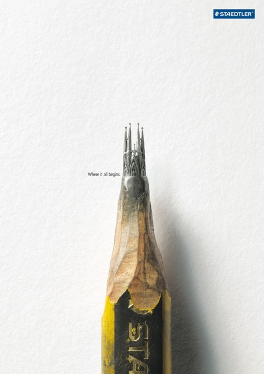 看看Staedtler文具公司的這則廣告。 其中顯著體現(xiàn)了比例縮放的原則——首先,鉛筆已經(jīng)放大了很多,但重點仍然在被雕刻成精美大教堂的筆尖上。使用大幅度的比例縮放不僅能夠吸引觀眾看得更仔細,而且還強化了“大始于小”的概念。