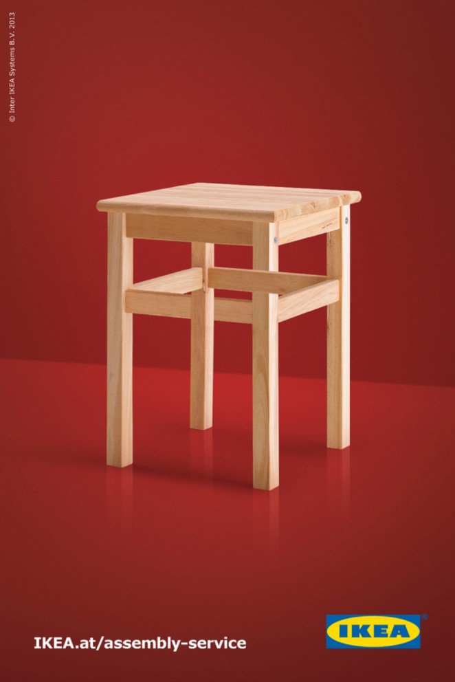 宜家通過在產(chǎn)品圖像上的一點巧妙修改,創(chuàng)造出了與潘洛斯三角形類似的又一“不可能”,以此來表現(xiàn)“困難”和“復(fù)雜”的概念,這也是他們對自家組合家具產(chǎn)品的自嘲。正如原來的潘洛斯三角形,這個廣告設(shè)計非常吸引人,通過在普通圖像上進行一點超現(xiàn)實改造,十分巧妙地讓消費者捕捉到宜家想要傳遞的消息。