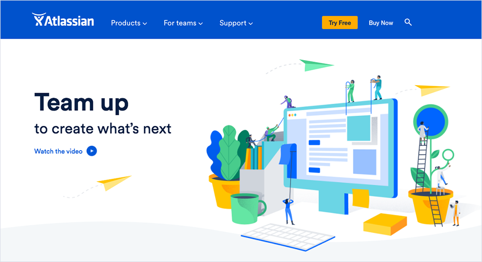 Atlassian用配色明快的圖形插畫描繪了齊心協(xié)力的工作場景,烘托出“Team up”的產(chǎn)品價值主張: