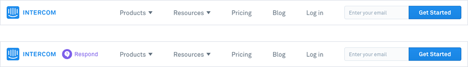 繼續(xù)以Intercom為例,首頁導(dǎo)航在滾動時保持常駐。當(dāng)點(diǎn)擊首頁導(dǎo)航到達(dá)子產(chǎn)品頁面后,導(dǎo)航保持一致,只是在原先的主LOGO旁多了一個子產(chǎn)品LOGO來表明當(dāng)前所在頁面,點(diǎn)擊主LOGO可以返回首頁: