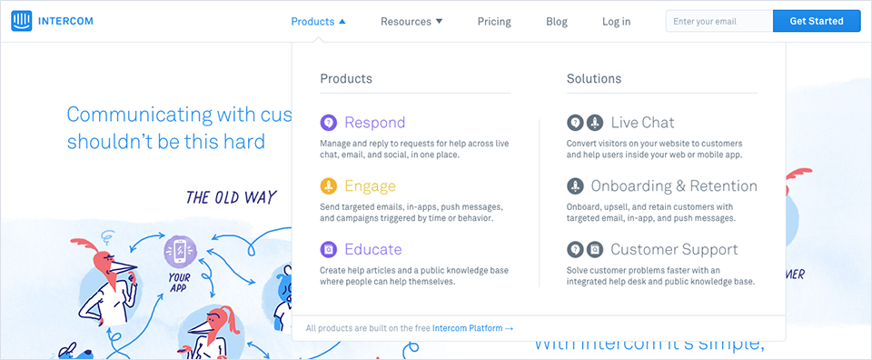 以Intercom為例,它是一款大型CRM應(yīng)用,公司旗下有三大子產(chǎn)品。官網(wǎng)首頁設(shè)置了5個一級導(dǎo)航,其中前兩個是折疊導(dǎo)航。最重要的Products導(dǎo)航的下拉菜單中按照產(chǎn)品和解決方案兩個維度展示了對應(yīng)的信息。配合icon和簡介,有序又直觀: