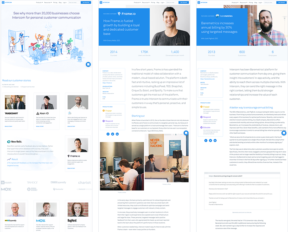 Intercom在客戶故事這方面下足了功夫,每個重點(diǎn)客戶都有內(nèi)容豐富的專題頁,里面有客戶公司簡介,描述了用Intercom的哪些產(chǎn)品解決了哪些問題,有從他們產(chǎn)品角度出發(fā)的第三人稱描述,也有客戶的第一人稱陳述: