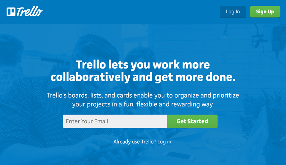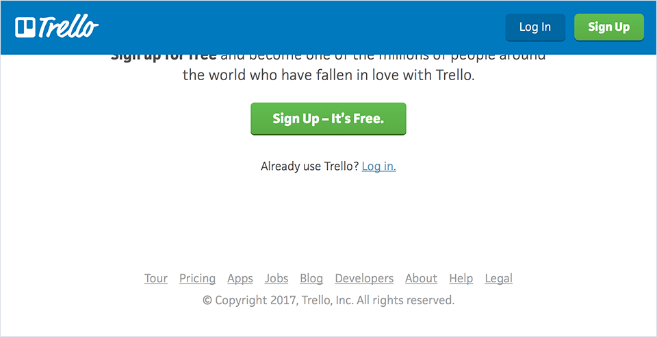 例如辦公協(xié)作應(yīng)用Trelllo的官網(wǎng)頂部沒有導(dǎo)航,只保留了登陸和注冊入口。頁面的信息組織按照“頭圖-功能總覽-功能細(xì)節(jié)-客戶展示-注冊試用”的順序由淺入深、從宏觀到微觀的順序引導(dǎo)訪客完成瀏覽和轉(zhuǎn)化。到頁面底部才會出現(xiàn)一排弱弱的鏈接: