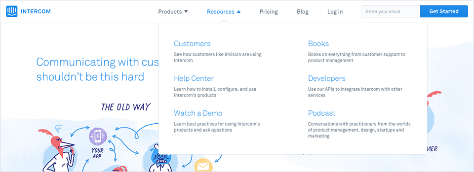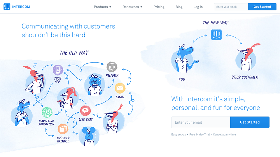 Intercom用生動的手繪風(fēng)插畫描繪了一副工作中遭遇的混亂場景,引出了使用Intercom可以結(jié)束這一切混亂的概念: