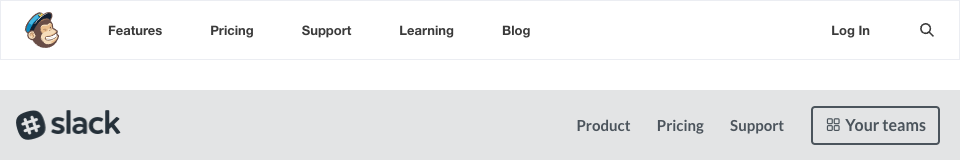 例如企業(yè)郵件應(yīng)用Mailchimp和Slack就是扁平結(jié)構(gòu)的典型代表,它們的導(dǎo)航都只有一級,把所有頁面入口都放在外面,最重要的功能、定價位于前兩個位置,其余的根據(jù)重要性遞減排列,最右邊一般會放注冊或登陸入口: