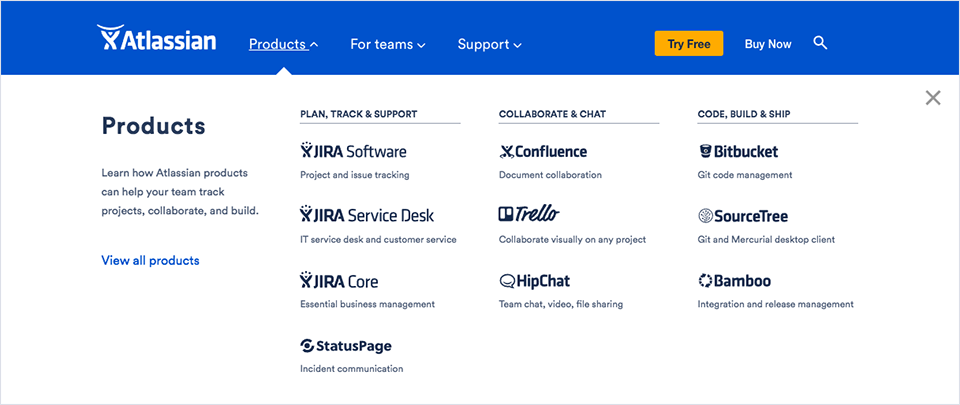 再看看Atlassian的設(shè)計(jì)。到達(dá)子產(chǎn)品頁后會保留主導(dǎo)航,隨著頁面滾動,子產(chǎn)品導(dǎo)航會把主導(dǎo)航推出,繼而代替主導(dǎo)航的位置: