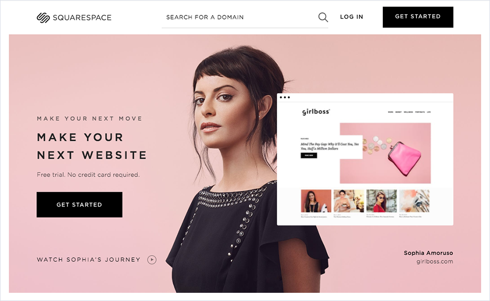 自助建站應(yīng)用Squarespace用高清的客戶肖像圖配合產(chǎn)品界面,來表現(xiàn)他們的應(yīng)用可以為不同人群定制專屬網(wǎng)站的理念: