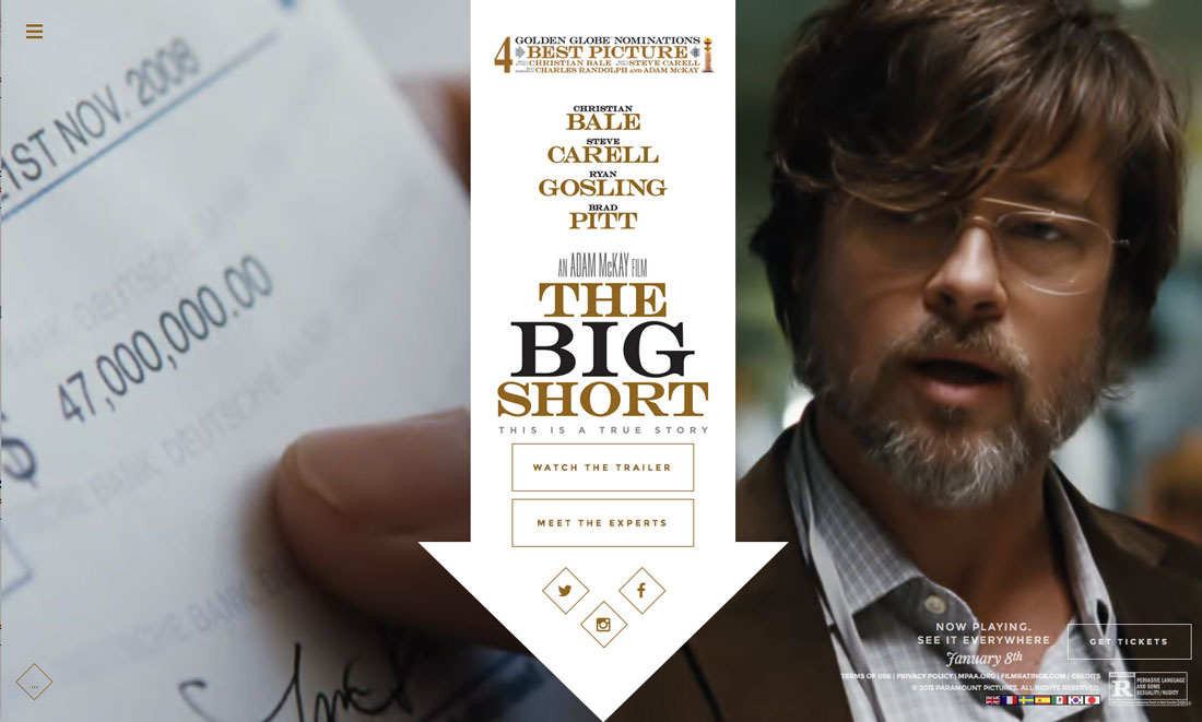 在上面 The Big Short movie 的網(wǎng)站中,為用戶提供了大量的信息。視頻剪輯足以使你對(duì)電影感興趣,并且有一個(gè)按鈕來觀看預(yù)告片。你對(duì)這個(gè)真實(shí)的故事感興趣嗎?同時(shí),頁面上還具備一個(gè)按鈕來于專家會(huì)面。你有沒有看過它,想分享你的想法?這有社交媒體按鈕可以馬上幫你做到這一點(diǎn)。從一開始就有很多方法與網(wǎng)站進(jìn)行互動(dòng)。