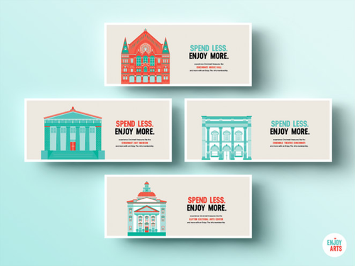 在下面的設(shè)計(jì)案例中,是介紹在美國(guó)辛辛那提,有著當(dāng)?shù)匚幕瘹庀⒌慕ㄖ拿餍牌.?dāng)然,建筑在明信片中是最大的設(shè)計(jì)要素,但關(guān)鍵詞“Enjoy more”卻更能吸引眼球。這當(dāng)然是因?yàn)椋念伾亲畎担ㄓ? Darkest)的。