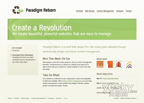 這個(gè)網(wǎng)站在960 Grid website上有展示。它的版面排列很連貫也很引人注目。我很欣賞它將主要內(nèi)容整齊地排在左邊的做法,盡管有些大級(jí)別的頭部破壞了這個(gè)規(guī)則并排到了左側(cè)邊欄里面。對(duì)留空的大量使用和字體反差大小的使用都非常不錯(cuò)。
