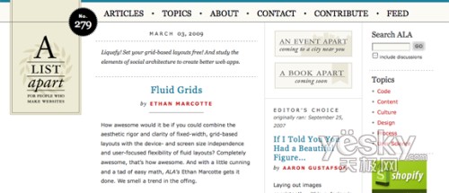 A List Apart中使用的可視格欄非常有特色。里面的欄目設(shè)計(jì)良好,把所有包含內(nèi)容都變得易于閱讀。研究表明過(guò)寬的欄目會(huì)造成嚴(yán)重的閱讀困難。在跟隨那么寬的欄目中的文字時(shí),你的眼睛會(huì)變得很累。
