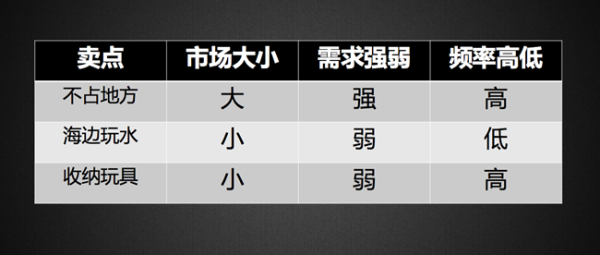 顯然,可折疊不占地方市場大,需求強,頻率高,是王牌賣點,值得重點說,說透,其他相對不重要,可以說得少,篇幅小。這樣分析下來,即使不做大量調(diào)研,也能獲得比較靠譜的結(jié)論。