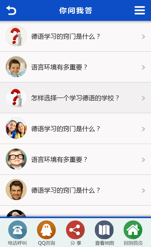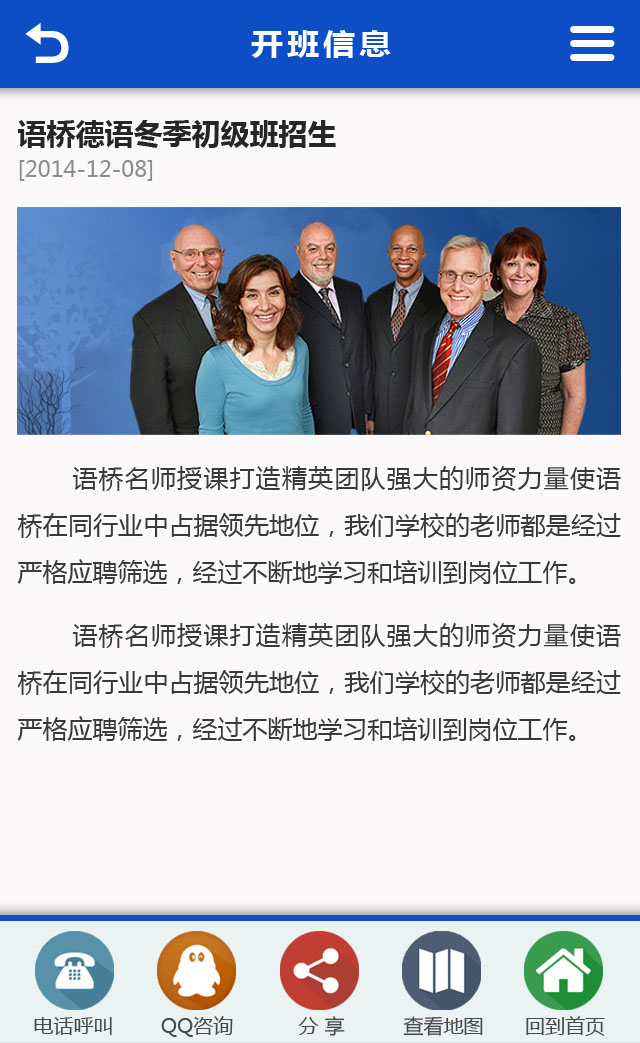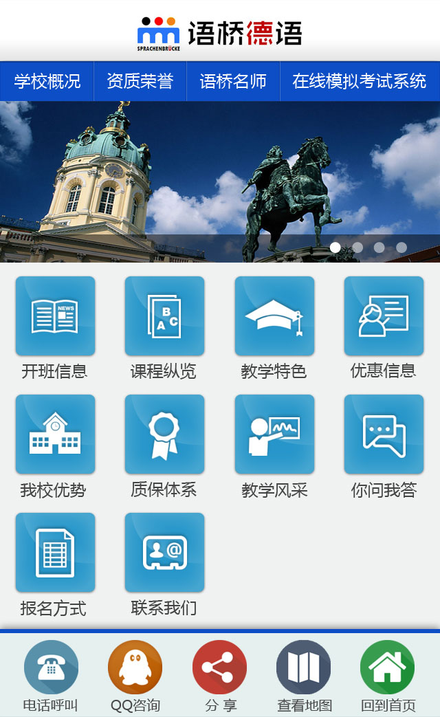 語(yǔ)橋德語(yǔ)手機(jī)網(wǎng)站欄目:開(kāi)班信息 課程縱覽  教學(xué)特色  優(yōu)惠信息 我校優(yōu)勢(shì)  質(zhì)保體系 教學(xué)風(fēng)采  你問(wèn)我答  報(bào)名方式 聯(lián)系我們